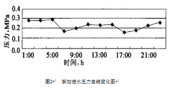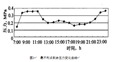 通過測定某泵站最不利點的水壓變化值, 壓力變化范圍為0115 ~ 0136MPa, 如果這部分壓力能節(jié)省下來,可以節(jié)省大量能耗, 常規(guī)泵站設(shè)定最不利點出流水頭