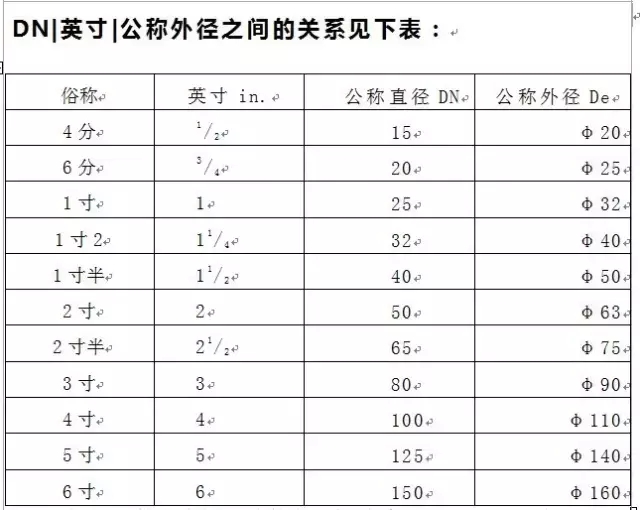 (1) 管件尺寸與閥門通徑及英寸對照表: