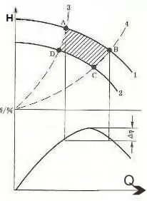 如上圖中的曲線1上的AB段,在此范圍內(nèi)泵運(yùn)行的效率下降不大。通過(guò)改變轉(zhuǎn)速或切制葉輪也叫擴(kuò)大泵的運(yùn)行機(jī)制范圍,曲線2即是改變轉(zhuǎn)速或切割葉輪前后的特性曲絨.曲線3、4是改變轉(zhuǎn)速速的相似拋物線或