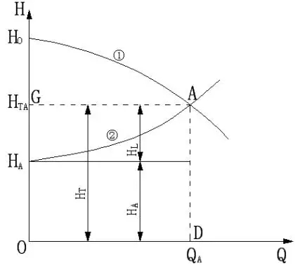 揚程特性曲線和管阻特性曲線的交點,稱為供水系統(tǒng)的工作點,如圖1中的A點所示。在這一點:供水系統(tǒng)即滿足了揚程特性①,也符臺了管阻特性②。供水系統(tǒng)處于平衡狀態(tài),系統(tǒng)穩(wěn)走運行。