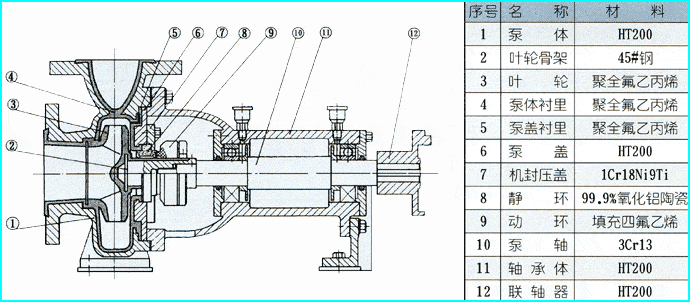 主要零部件:泵體、葉輪、密封環(huán)、葉輪螺母、泵蓋、密封部件、中間支架、軸、懸架部件。