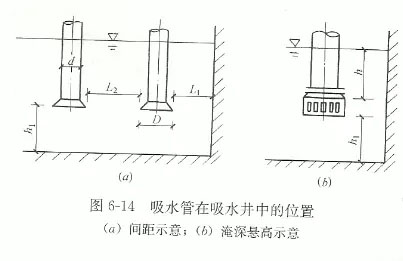 (4)吸水管安裝在吸水井內(nèi),吸水井有效容積應(yīng)不小于最大一臺(tái)泵5分鐘的抽水量。為了防止在吸水管進(jìn)口處產(chǎn)生旋流吸人空氣.所以要求進(jìn)口要有一定的淹沒(méi)深度、懸高和一定的間距。吸水管進(jìn)口在吸水井中的位置要求如圖6-14所示。