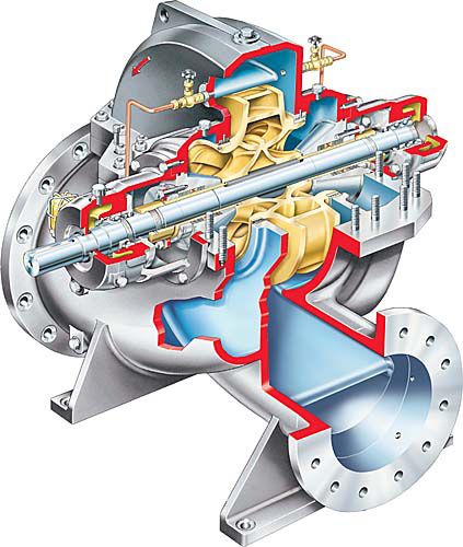 2、雙側(cè)進(jìn)水式泵:又叫雙吸泵,即葉輪兩側(cè)都有一個進(jìn)水口。