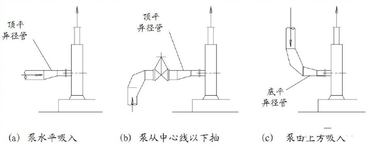 當(dāng)排污泵入口管系統(tǒng)有變徑管時(shí),管徑≥DN65采用偏心大小頭以防變徑處氣體積聚。變徑管的安裝方注如圖所示,即入口法蘭前彎頭向下時(shí),變徑管頂平;彎頭向上時(shí),變徑管底平。