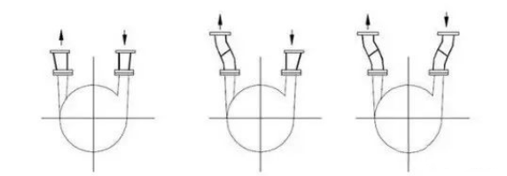 當(dāng)泵的吸入口和排出口在同一個(gè)垂直面上時(shí),為便于安裝閥門,進(jìn)出口可用偏心異徑管或兩個(gè)45°彎頭增大進(jìn)出口管間距: