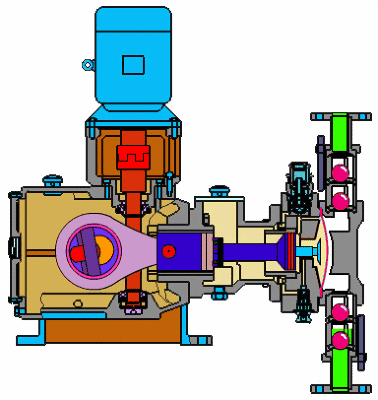 電機(jī)經(jīng)聯(lián)軸器帶動(dòng)蝸桿并通過(guò)蝸輪減速使主軸和偏心輪作回轉(zhuǎn)運(yùn)動(dòng),由偏心輪帶動(dòng)弓型連桿的滑動(dòng)調(diào)節(jié)座內(nèi)作往復(fù)運(yùn)動(dòng)。當(dāng)柱塞向后死點(diǎn)移時(shí),泵腔內(nèi)逐漸形成真空,吸入閥打開(kāi),吸入液體;當(dāng)柱塞向前死點(diǎn)移動(dòng)時(shí),此時(shí)吸入閥關(guān)閉,排出閥打開(kāi),液體在柱塞向進(jìn)一步運(yùn)動(dòng)時(shí)排出。在泵的往復(fù)順還工作形成連續(xù)有壓力、定量的排放液體。