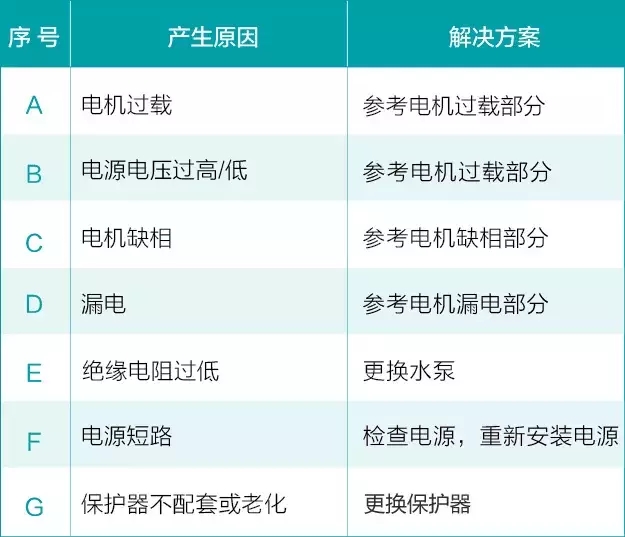 如果所配套的電源保護(hù)器與水泵電機(jī)是吻合的,在正常情況下,保護(hù)器是不會(huì)跳閘的。保護(hù)器跳閘的主要原因有: