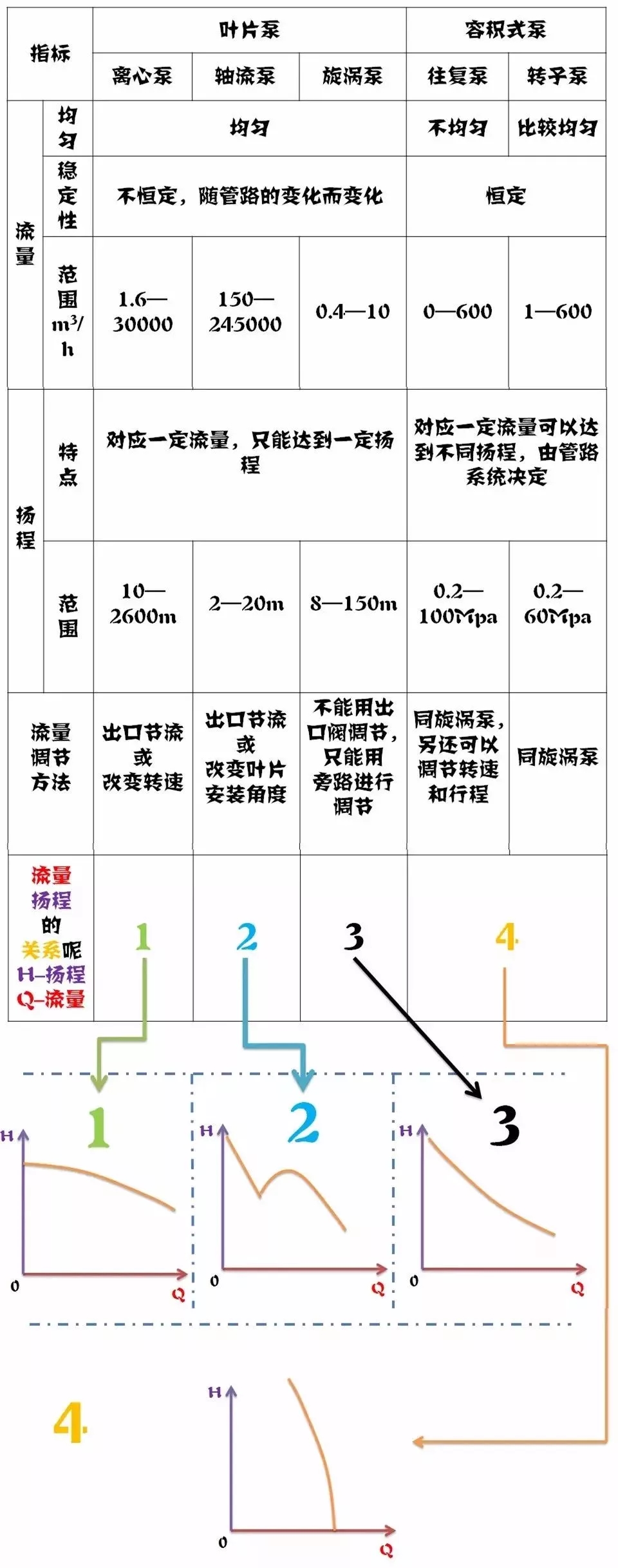 離心泵容積泵的揚(yáng)程計算是選擇泵的重要依據(jù),泵揚(yáng)程與流量的關(guān)系可以參照下面這張圖。