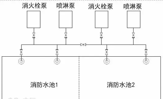 方案一:本方案為相對較好的方案,一個消防水池檢修,不影響消防水泵吸水。