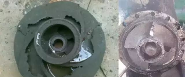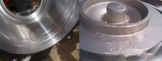 1.故障表現(xiàn):圖示是由灰鑄鐵材料鑄造的流程泵葉輪在5年時(shí)間內(nèi)被含有少量水泥泡沫的水磨損的情況,磨蝕問(wèn)題更多的是設(shè)計(jì)方選材不當(dāng)或泵型選擇不當(dāng)造成的,或者是工藝介質(zhì)被污染導(dǎo)致的。