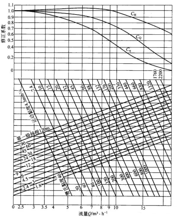 圖2.離心泵性能修正系數(shù)(流量>20m3/h)