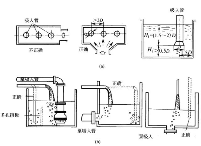 ②吸液池的進(jìn)液管、回流管、廢液收集管要遠(yuǎn)距離泵的吸入管口,以免氣泡尚未消失就被泵吸入。同時(shí)吸入管不能放在池中央,也不能太靠近池壁,一般要離池壁大于1.5D,以免產(chǎn)生漩渦或抽空。