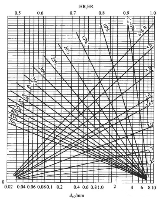 ③泵輸送沉降類漿體的性能換算:按漿體的質(zhì)量分?jǐn)?shù)CW,固體顆粒相對(duì)密度S和顆粒粒徑d50,查圖5。
