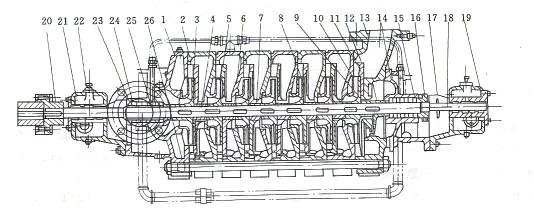 1-進(jìn)水段 2-中段 3-升輪 4-軸 5-導(dǎo)輪 6-承磨環(huán) 7-葉輪擋套 8-導(dǎo)葉套 9-平衡盤(pán) 10-平衡套 11-平衡環(huán) 12-出水段導(dǎo)輪 13-出水段 14-尾蓋 15-軸套乙 16-軸套螺母 17-擋水圉 18-平衡盤(pán)指針 19-軸承乙部件 20-聯(lián)軸器 21-軸承甲部件 22-油環(huán) 23-軸套甲 24-填料壓蓋 25-水封環(huán) 26-拉緊螺栓
