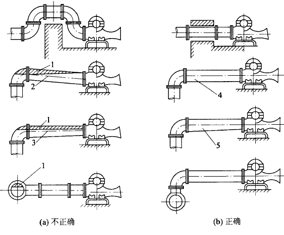 氣囊的存在,不僅可能直接影響到泵的性能(出力不足,甚至不出液),而且還可能會引起氣蝕。為了避免管道布置時出現(xiàn)氣囊,GB50275-2010 《風(fēng)機(jī)、壓縮機(jī)、泵安裝工程施工及驗(yàn)收規(guī)范》對泵的吸入管道的安裝,給出了參考示例,見圖1。