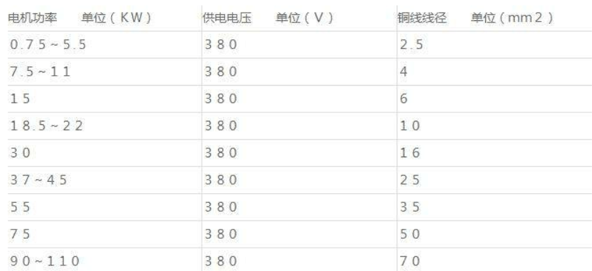 在供電線路不是很長的情況下,功率與線徑關(guān)系(國標(biāo)銅線,電機(jī)功率單位(KW)供電電壓單位(∨)銅線線徑單位(mm2)。