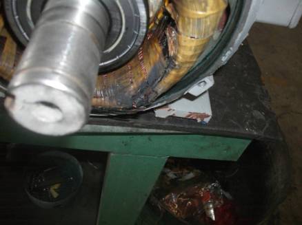 繞組全部變黑色,端部扎帶變色并且變脆甚至斷裂。