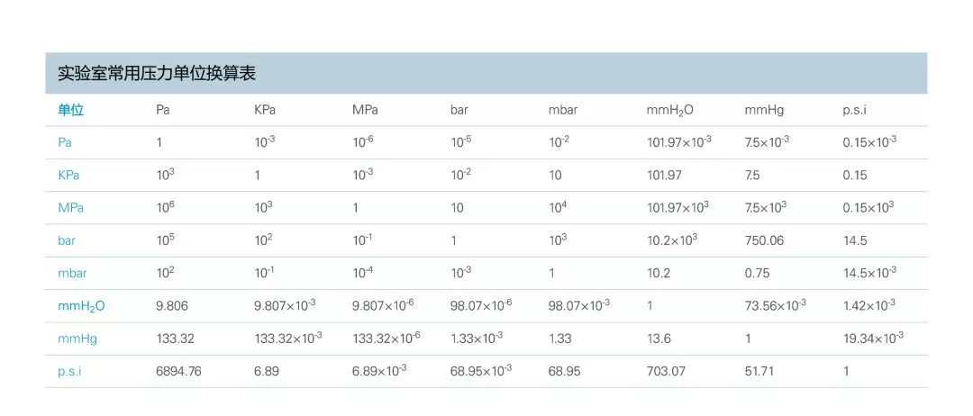 他們Pa, KPa, MPa, mbar, bar, mmH2O, Psi之間的換算方式如下表: