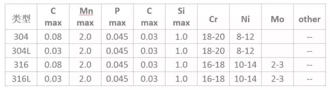 不銹鋼:耐空氣、蒸汽、水等弱腐蝕介質(zhì)或具有不銹性的鋼種。通常使用的鋼種為304、304L、316、 316L,是奧氏體不銹鋼的300系列鋼。