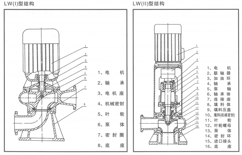4、LW(1)型泵與電機(jī)直聯(lián)同軸,屬機(jī)電一體化產(chǎn)品,結(jié)構(gòu)緊湊,性能穩(wěn)定。