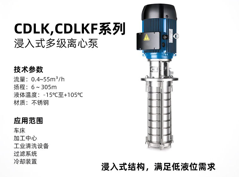 CDLK/CDLKF用于輸送機床冷卻液、潤滑液冷凝水輸送、工業(yè)清洗設(shè)備和其它適合浸入式泵使用的場合,適應(yīng)于不同溫度、流量和壓力范圍,CDLK適用于無腐蝕性液體,CDLKF適用于輕度腐蝕性液體。