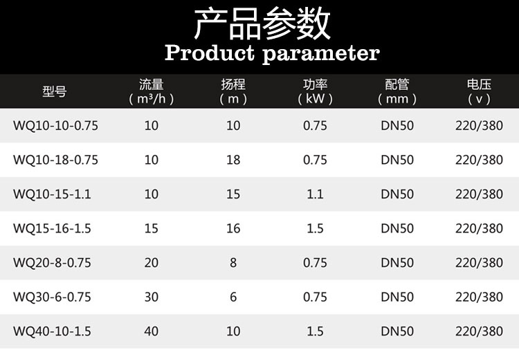 220V單相潛水排污泵性能參數(shù):