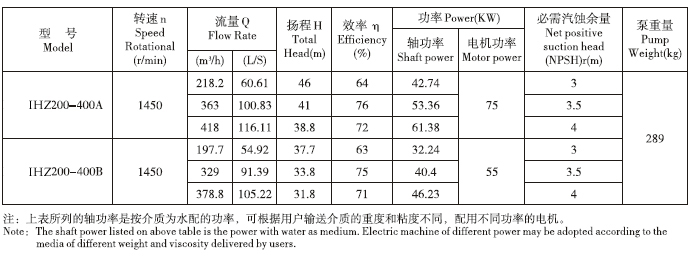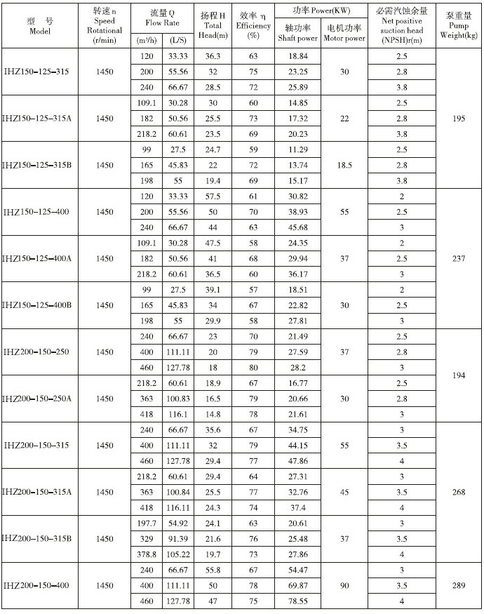 IHZ直聯(lián)化工離心泵性能參數(shù):