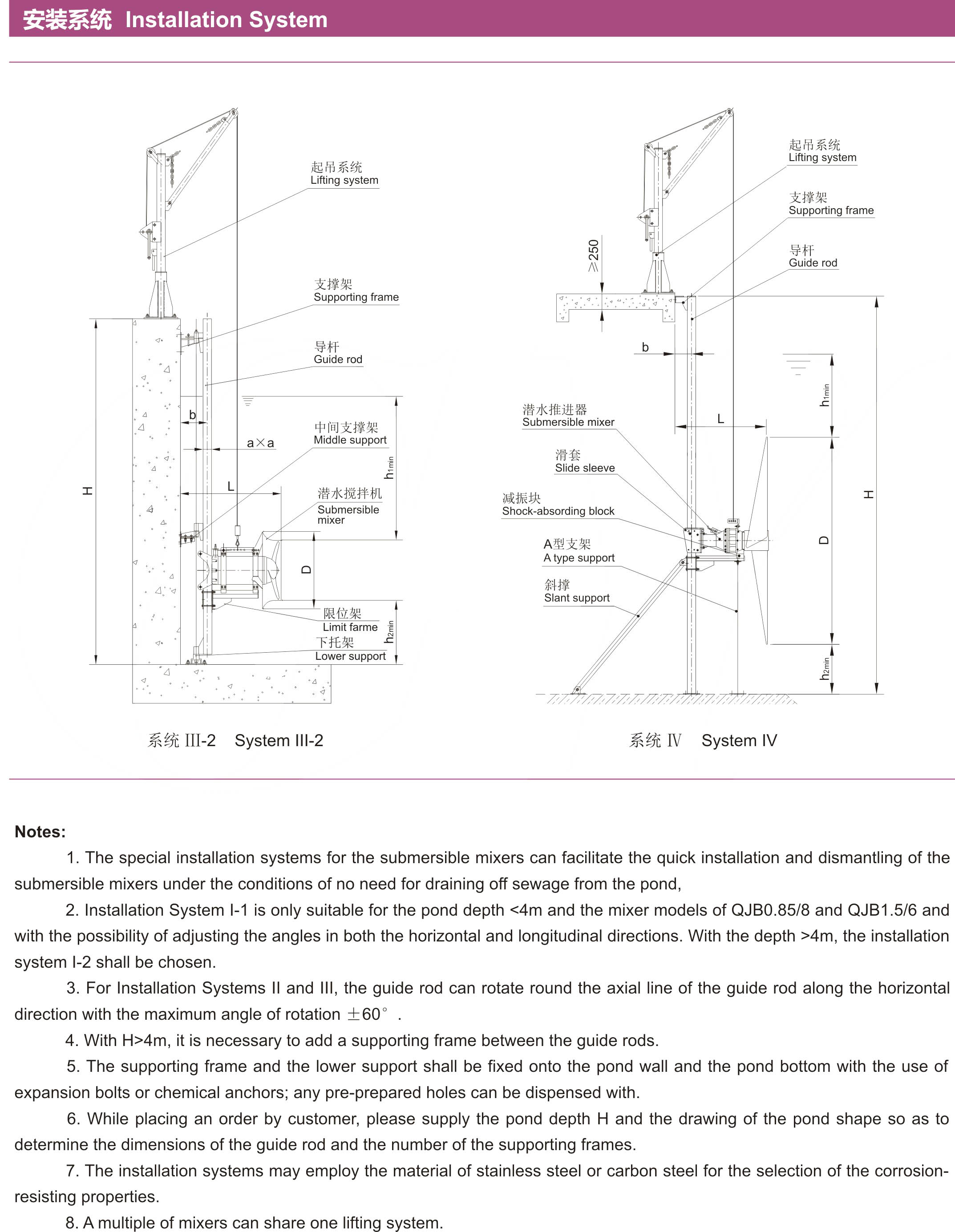 2、安裝系統(tǒng)Ⅰ— 1只適用于池深<4m,機(jī)型為QJB0.85/8 和QJB1.5/6,且可在水平方向和垂直方向調(diào)節(jié)角度; 當(dāng)池深>4m時(shí),應(yīng)選用安裝系統(tǒng)Ⅰ— 2型;