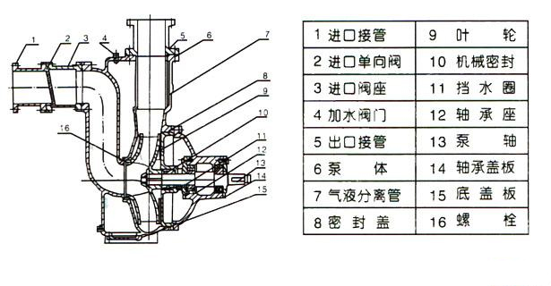 ZW系列自吸式無堵塞排污泵,主要由泵體.葉輪、后蓋、機械密封、泵軸、軸承座、進口閥、氣液分離管、加水閥門、迸、排接管等組成。泵的結(jié)構見圖。