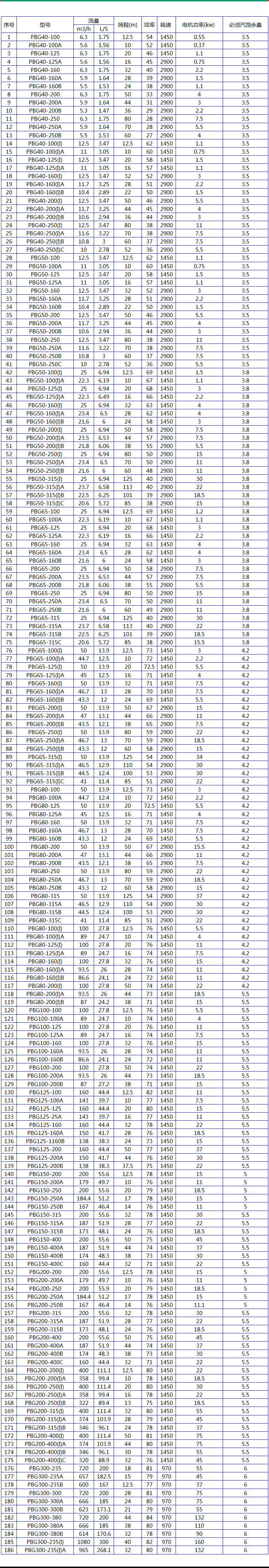 PBG型屏蔽式管道泵性能參數(shù):