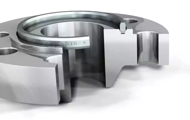 Ring Joint Face環(huán)連接面密封的法蘭,也屬于窄面法蘭,并在法蘭的突面上開出一環(huán)狀梯形槽作為法蘭密封面,和榫槽面法蘭一樣,這種法蘭在安裝和拆卸時必須在軸向?qū)⒎ㄌm分開,因此,在管線設(shè)計時要考慮到將法蘭在軸向分開的可能。