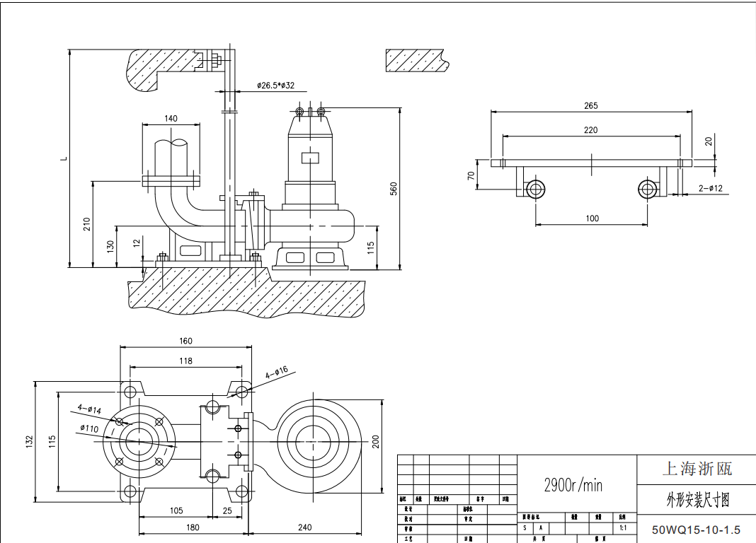 潛水泵耦合式安裝時(shí),平面的開(kāi)孔需考慮潛水泵的最小安裝尺寸。案例中A向視圖表示了水泵的最小安裝孔的大小尺寸,1000×700mm。