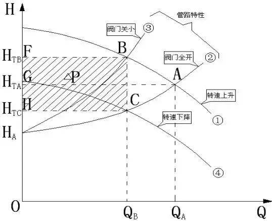 以適應擁護對流量的需求。這時,管路特性將隨著閥門開度的改變而改變,但揚程特性不改變。由圖2所示,設用戶所需流量QA減少為QB,當通過關小閘門來實現(xiàn)時,管阻特性將改變?yōu)榍€③,而揚程特性則