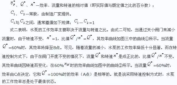 比較上述兩種調節(jié)流量的方法,可以看出:在所需流量小于額定流量的情況下,轉速控制時的揚程比閥門控制時的小得多,所以轉速控制方式所需的供水功率也比閥門控制方式小得多。兩者之差→P便是轉速控制
