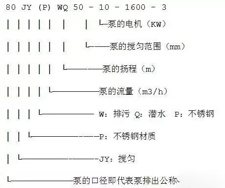 Q:潛水W:排污G:管道Y:液下N:泥漿Z:自吸L:立式AS:撕裂JY:攪勻P:不銹鋼B:防爆QW(WQ)無堵塞潛水式排污泵