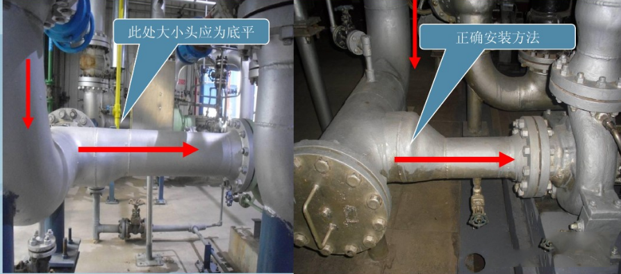 當(dāng)排污泵入口管系統(tǒng)有變徑管時(shí),管徑≥DN65采用偏心大小頭以防變徑處氣體積聚。變徑管的安裝方注如圖所示,即入口法蘭前彎頭向下時(shí),變徑管頂平;彎頭向上時(shí),變徑管底平。