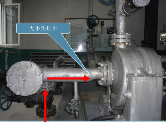當(dāng)泵的吸入口和排出口在同一個(gè)垂直面上時(shí),為便于安裝閥門,進(jìn)出口可用偏心異徑管或兩個(gè)45°彎頭增大進(jìn)出口管間距: