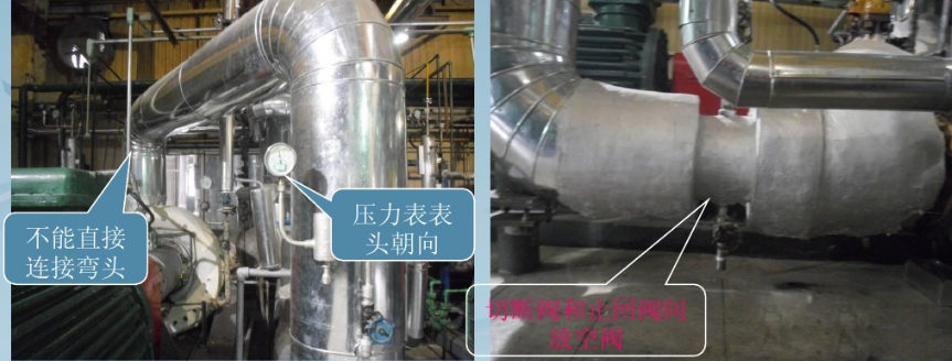 排污泵出口不宜直接連接彎頭。泵出口的切斷閥和止回閥間用泄液閥放凈。泵出口壓力表安裝在泵口和止回閥之間的短節(jié)上,也可安裝在出口異徑管上。壓力表接管要有根部閥,壓力表表頭朝向操作面。