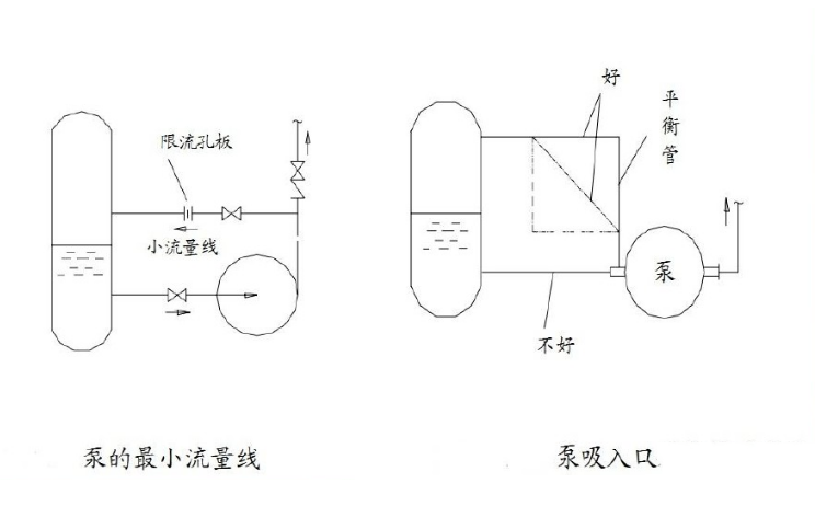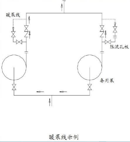 泵的保護(hù)管線——旁通線:啟動(dòng)高揚(yáng)程泵時(shí),出口閥單方面受壓過(guò)大,不易打開,若強(qiáng)制開啟,將有損壞閥桿、閥座的危險(xiǎn)。在出口閥前后設(shè)置帶有限流孔板的旁通線,便可容易開啟。同時(shí),旁通線還有減少管線振動(dòng)和噪聲的作用。