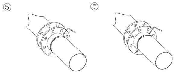 2、按圖示將兩端螺栓螺母分別輕輕插入兩端對(duì)應(yīng)的法蘭孔(法蘭式蝶閥需調(diào)整墊片位置),將螺母稍加擰緊以校正法蘭面的平面度;