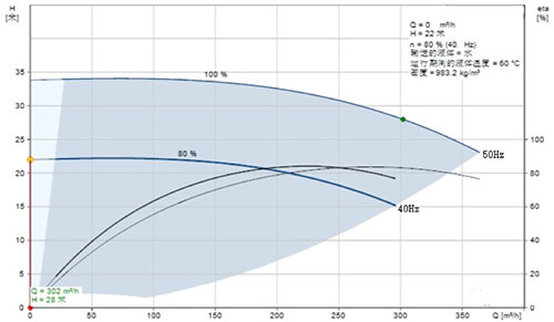 為了更好的解釋,我們來舉個(gè)例子闡述,某暖通系統(tǒng),設(shè)計(jì)給定每臺(tái)泵參數(shù)(流量:302m/h,揚(yáng)程:28m),管損22m,假設(shè)實(shí)際使用參數(shù)也為此參數(shù)。根據(jù)此參數(shù),泵選型為如下圖泵,此泵經(jīng)過變頻計(jì)算,40Hz閉閥揚(yáng)程為22m,此泵最低運(yùn)行頻率為40Hz。