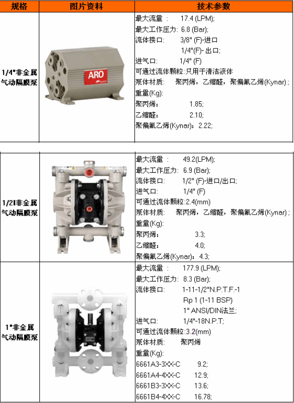 已被廣泛地應(yīng)用,因?yàn)樗旧砭邆淞撕芏鄠鹘y(tǒng)電泵所不能代替的優(yōu)點(diǎn),如:氣動的設(shè)備非常安全討于一些易燃易爆的化工物料沒有后顧之憂;耐腐蝕和防滲漏,因?yàn)榇吮脹]有軸動密封圈沒有滲漏的可能;任意的無級變速,在輸出端可做流量的任意調(diào)整而不用附加裝置,此泵有空載或超負(fù)荷的發(fā)熱燒泵;沒有齒輪和葉輪,能夠輸送沙水混合物;是靠特殊膜片的收縮擠壓而將流體吸入或輸岀,對化工方面的粘稠狀物料非常適合等。ARO泵具備獨(dú)一無二的專利氣閥,絕無死點(diǎn),排氣口不結(jié)冰,比其它氣泵流量更大。