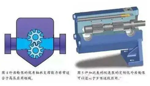 外齒輪泵在泵送動(dòng)作上與內(nèi)齒輪泵有著相似之處,也是通過兩個(gè)齒輪的進(jìn)入和脫離嚙合來帶動(dòng)液體流動(dòng)的(圖4)。但是,外齒輪泵采用了兩個(gè)相互嚙合轉(zhuǎn)動(dòng)的完全一致的齒輪。每個(gè)齒輪均由一根齒輪軸支撐,每個(gè)齒輪兩側(cè)均有軸承。在典型情況下,這四個(gè)軸承均工作于所泵送的液體內(nèi)。