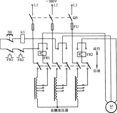 工作原理如圖所示:啟動電動機時,將刀柄推向啟動位置,此時三相交流電源通過自耦變壓器與電動機相連接。待啟動完畢后,把刀柄扳至運行位置切除自耦變壓器,使電動機直接接到三相電源上,電動機正常運轉(zhuǎn)。此時吸合線圈KV得電吸合,通過連鎖機構(gòu)保持刀柄在運行位置。停轉(zhuǎn)時,按下SB按鈕即可。