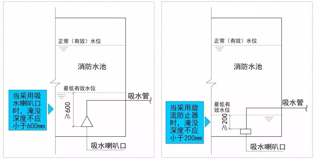 三、消防水泵吸水口的淹沒深度應滿足消防水泵在最低水位運行安全的要求。吸水管喇叭口在消防水池最低有效水位下的淹沒深度應根據吸水喇叭口的水流速度和水力條件確定,但不應小于600mm,當采用旋流防止器時,淹沒深度不應小于200mm;(5.1.13)