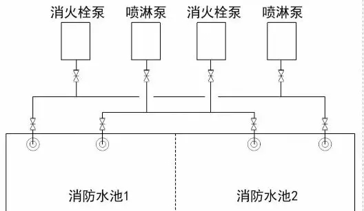 方案四(不應):本方案存在較大隱患,當一格(或一座)消防水池檢修時,泵組不再具備一用一備的功能。