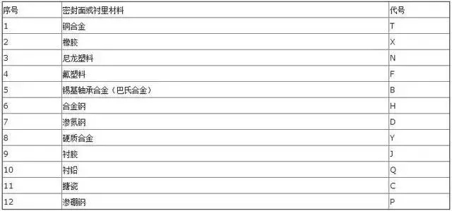 2、閥門型號密封面或襯里材料代號表: