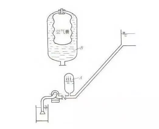 如圖2所示,在壓力管路上設置空氣缸,利用氣體體積與壓力成反比的原理,當發(fā)生水錘時,管道內壓力升高,空氣被壓縮,起氣墊的作用;當管道內形成負壓,甚至發(fā)生水柱分離時,它向管道內補水,可以有效地消減停泵水錘的危害。