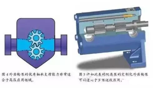 外齒輪泵在泵送動作上與內(nèi)齒輪泵有著相似之處,也是通過兩個齒輪的進入和脫離嚙合來帶動液體流動的(圖4)。但是,外齒輪泵采用了兩個相互嚙合轉(zhuǎn)動的完全一致的齒輪。每個齒輪均由一根齒輪軸支撐,每個齒輪兩側(cè)均有軸承。在典型情況下,這四個軸承均工作于所泵送的液體內(nèi)。