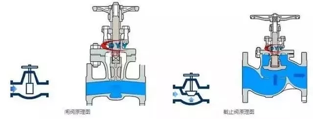 截止閥是低進(jìn)高出,從外觀看有明顯的管道不在一相水平線上。閘閥流道在一個(gè)水平線上。閘閥的行程比截止閥的要大。